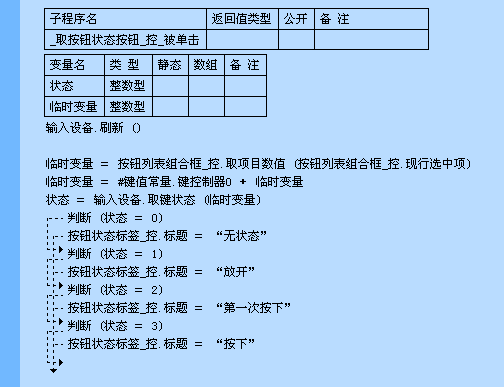 获取给定一个键的状态。返回0表示无状态,1表示此键被放开, 2表示此键被第一次被按下, 3表示此键一直按着。