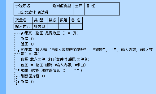为高级用户提供,初级用户无需掌握;把一个位图旋转一个角度,并返回旋转后的位图。如果失败,随后立即调用本对象的“取错误信息”命令将取得一个非空文本,该文本为失败的原因。注意:对一个位图进行旋转后会有少许失真。如果本旋转算法的精度无法满足要求,请根据实际情况用“取某点颜色/索引”、“置某点颜色/索引”结合相应的的旋转算法进行操作。