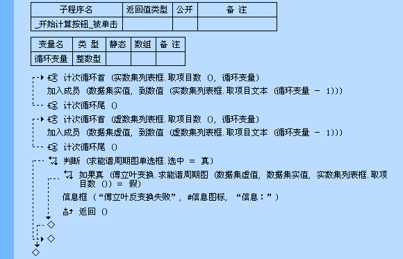 语法: 逻辑型 傅立叶变换.求能谱周期图 (数据集实值,数据集虚值,时间间隔)