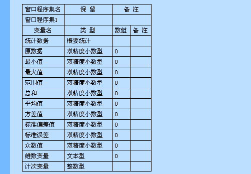 语法: 逻辑型 概要统计.统计数据概要 (原数据,最小值,最大值,范围值,总和,平均值,方差值,标准偏差值,标准误差,众数值)