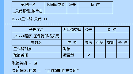 语法: 无返回值 _Excel程序_工作簿即将关闭 (工作簿对象,取消关闭)