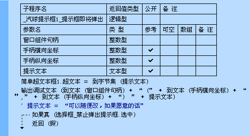 语法: 逻辑型 _汽球提示框_提示框即将弹出 (窗口组件句柄, 手柄横向坐标, 手柄纵向坐标, 提示文本)