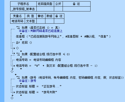 根据电话号码,用户名,帐号密码等拨号上网。在拨号前,应该先判断网络是否已连接上;拨号后要想知道是否已连接上,必须让“是否等待连接完毕”参数为真。