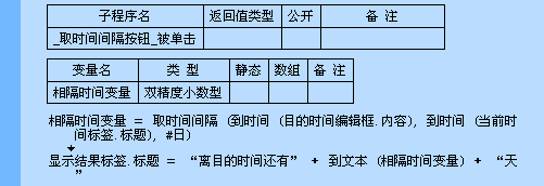 程序运行后,“当前时间标签”显示出当前时间,在“目的时间编辑框”中输入一个时间,通过“取时间间隔”命令,取出2个时间相差多少天,并显示在“显示结果标签”中。