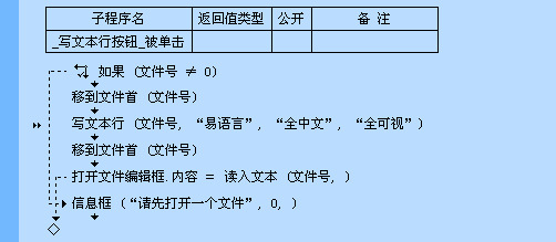 使用“打开按钮”打开一个文本文件并显示在编辑框中,然后使用“写文本行”按钮在该文件首行插入3行文本。该命令插入的整行文本,可以自动在行尾加换行符。