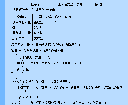取得所有被选择的项目位置索引,放到数组中,并用信息框显示。