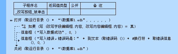 首先把要操作的数据库打开,然后执行“写()”命令,程序将改写“改写字段编辑框”中输入的字段,改写内容为“改写内容编辑框”中的内容。如果改写成功,会弹出信息框显示“写入数据成功”;如果改写失败,会弹出信息框提示失败,将本次操作的错误码和错误信息取出,并显示在信息框中,这样用户就可以知道操作数据库失败的错误原因。