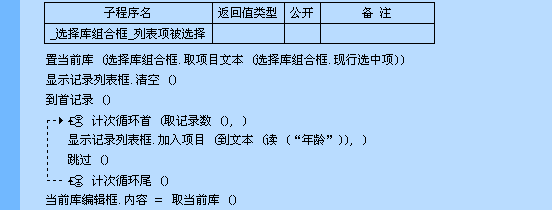 使用“置当前库()”命令将当前库设置为组合框中所选数据库,并使用记次循环命令将当前库所有记录的“年龄”显示在列表框中。