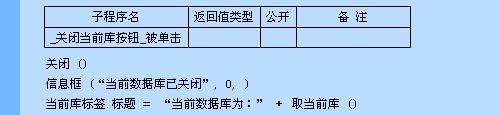 启动窗口创建完毕后打开2个数据库,按下“关闭当前库”按钮后,“关闭()”命令将关闭当前数据库;按下“关闭指定库”按钮后,会弹出一个输入框,使用输入框来输入欲关闭的数据库名。注意:“关闭”命令可以关闭当前数据库,也可以关闭指定数据库。