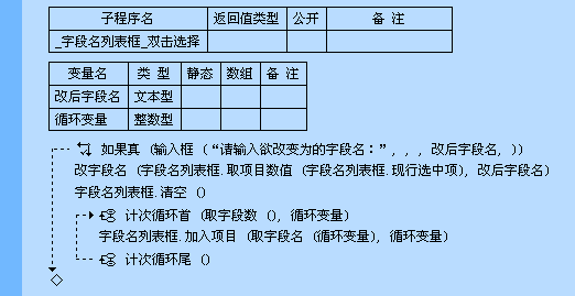 在列表框加入项目的同时,将项目数值设置为对应字段在数据库中的位置索引(字段和列表项目通过项目数值相联系),所以在修改字段名时,“改字段名()”命令的“字段名称或位置”参数,直接填写列表框现行选中项的项目数值即可。