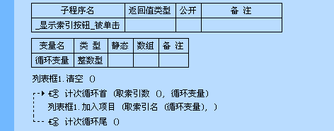 启动窗口创建完毕后,打开数据库1,同时打开2个索引文件。当点击“显示索引”按钮,使用“取索引数()”命令将当前打开的索引数取出,并用该数值规定“记次循环首()”命令的循环次数,在循环中使用“取索引名()”命令依次将每个索引的名字取出,并添加到列表框中。