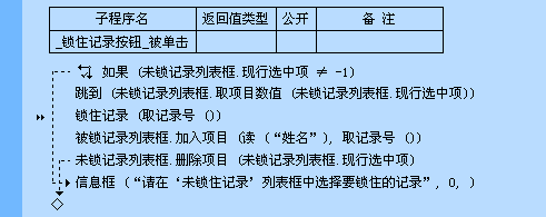 程序运行后,打开数据库1,并使用“未锁记录列表框”显示所有记录的“姓名”字段内容,列表框每加入一个记录,便将该记录对应的记录号设置为对应项目的项目数值。当点击“锁住记录”按钮,首先通过项目数值,将当前记录指针跳到选中记录位置,然后使用“锁住记录 ()”命令对该记录进行加锁,并将该记录添加到“被锁记录列表框”中,同时从“未锁记录列表框”中将该项删除。