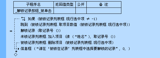 程序运行后,打开数据库1,并使用“未锁记录列表框”显示所有记录的“姓名”字段内容,列表框每加入一个记录,便将该记录对应的记录号设置为对应项目的项目数值。当点击“解锁记录”按钮,首先通过项目数值,将当前记录指针跳到被选中记录位置,然后使用“解锁记录 ()”命令解除记录的加锁效果,并将该记录添加到“未锁记录列表框”中,同时从“被锁记录列表框”中将该项删除。