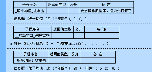 例程中,“_取平均值_被单击”子程序下运行的取平均值命令只将字段名为“年龄”的所有记录的平均值取出,而“_取平均值1_被单击”子程序中的取平均值命令是将所有年龄大于12的记录的年龄平均值取出。本命令的参数:计算表达式和记录条件就可以用上例中的方法表示。