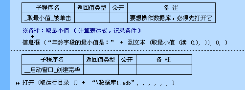 程序中,使用“取最小值()”命令将年龄字段的最小值取出,并显示在信息框中。