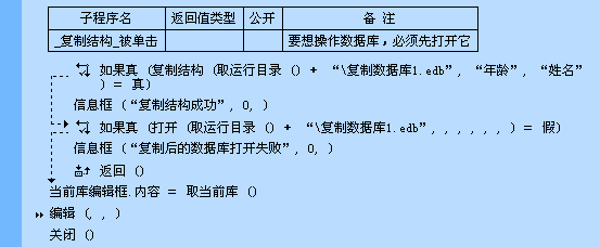 程序运行后,打开数据库1,并用编辑框显示出当前数据库名,当点击“复制结构”按钮,将数据库1的“年龄”和“姓名”字段复制到“复制数据库1”中,然后打开该数据库,并弹出数据库记录编辑器对该数据库进行编辑,编辑后关闭该数据库。