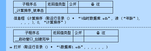 程序运行后,打开数据库1,并将数据库1的“年龄”字段内容显示在“排序前列表框”中。当“计算排序”按钮被单击,则使用“计算排序()”命令,对数据库1中的记录按“年龄”字段的从大到小顺序重新排列数据库记录,并将排序后的结果存放在“临时数据库”中,成功排序后打开排序后的数据库,并将该数据库中“年龄”字段的内容显示在“排序后列表框”中。