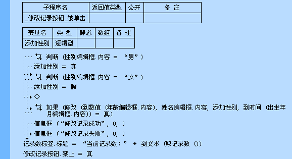 例程中,当添加了一条空记录后,“修改记录”按钮的禁止则为假。当“修改记录”按钮被单击,首先判断“性别编辑框”中的内容,如果是“男”则让“添加性别”变量为真,如果是“女”则让“添加性别”变量为假,然后使用“修改()”命令对当前添加的空记录内容进行修改,性别字段内容为“添加性别”变量的内容,其他记录的内容为对应编辑框中的内容,修改记录时要注意数据类型的转换,修改内容的数据类型要和对应字段的数据类型相同。