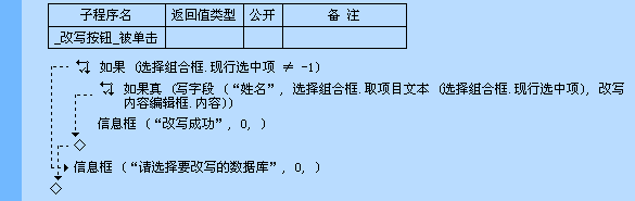 程序运行后打开2个数据库,并用“当前库标签”显示出当前的数据库,当“改写按钮”被单击,则使用“写字段()”命令将组合框中选择的数据库的姓名字段内容改写成“改写编辑框”中的内容,改写成功则弹出信息框提示。“写字段()”命令可以改写非当前数据库的指定字段内容。
