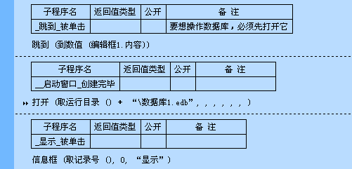 程序中新建了一个“显示记录”子程序,用来将当前记录的所有字段显示在对应的编辑框中。程序运行后打开数据库1并调用“显示记录”子程序,用来显示当前记录。当“跳到”按钮被单击,则弹出输入框,输入框中输入欲跳到的记录号后,则使用“跳到()”命令,将当前记录指针跳到所输入的记录号处。