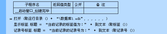 程序运行后打开数据库1,并使用“取标签()”命令将标签值取出,并显示在“显示标签”中;然后使用“取记录号()”命令将当前记录的记录号取出,并显示在“记录号标签”中。当“上一记录按钮”和“下一记录按钮”被单击,则将当前记录指针向前或向后跳过一条记录,并显示出当前记录的标签值和记录号。