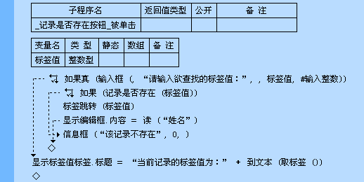 启动窗口创建完毕后,打开数据库1并用“显示标签值标签”显示出当前记录的标签值,当“记录是否存在按钮”被单击,则弹出输入框,用来输入标签值,并将输入的标签值存放在“标签值”变量中,然后使用“记录是否存在()”命令判断指定标签值的记录是否存在,如果存在则使用“跳转标签()”命令将当前记录跳到该标签值的记录上,并用编辑框显示出该记录的“姓名”字段内容。