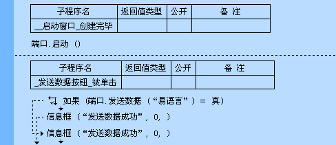 当窗口创建完毕便启动端口,按下发送按钮,端口将发送数据“易语言”。收到数据的端口,将会处理“数据到达”事件子程序中的代码。