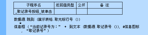 使用数据源的“跳到()”方法,将记录指针移动表格的行号对应的记录上,然后用信息框显示数据源的当前记录号。