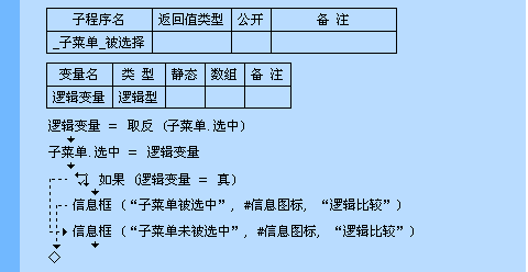 逻辑变量为逻辑型,子菜单.选中 为逻辑型。在此例程中,逻辑变量保存 子菜单.选中 的反值(真的反值为假),
