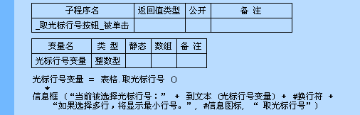 将表格中光标所选的行号取出,并存放在“光标行号变量”中,并用信息框显示该行号。