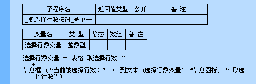 取出表格当前被选中的行数,保存在“选择行数变量”中,并用信息框显示选择行数。