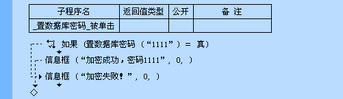 当点击“置数据库密码按钮”,首先判断数据库是否已经加密,如果是加密数据库首先弹出输入框提示输入密码,然后打开数据库,如果打开数据库成功,则判断如果“重试时间编辑框”中的内容不为空,则设置加锁重试时间,然后使用“置数据库密码()”命令对数据库进行加密。注意,当加密成功后,关闭加密后的数据库,如果再次打开该数据库,则要正确输入数据库密码才能打开数据库。