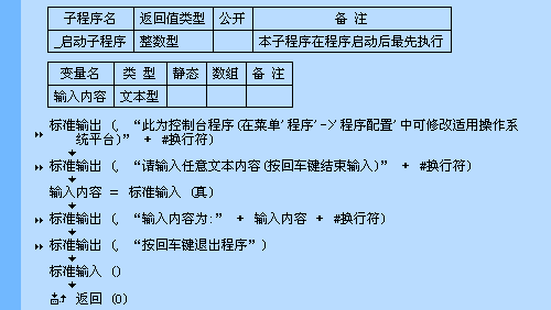 在控制台窗口中输出信息或接收信息。必须在菜单“程序”—>“程序配置”中,将程序设为Windows控制台程序或Linux控制台程序方可看到运行效果。