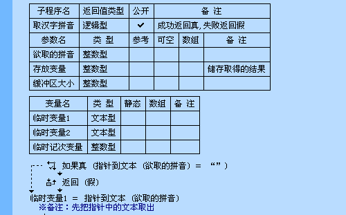 在动态链接库(DLL)内部的子程序中,通过“指针到文本”读取指针(此处为变量“欲取的拼音”)所指向的文本。
