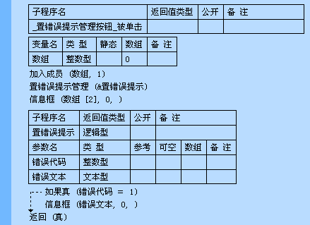 可选的; 子程序指针。注意该子程序必须接收两个参数,第一个参数为整数型,用作接收错误代码,第二个参数为文本型,用作接收详细错误文本。同时该子程序必须返回一个逻辑值,返回真表示已经自行处理完毕,系统将不再显示该错误信息,返回假表示由系统来继续显示该错误信息。以上设置必须完全正确,否则结果不能预测,另外,还请注意以下几点: 1、该错误提示子程序不要再引发新的错误; 2、在进入该错误提示子程序后,系统将自动关闭事件消息通知处理机制,也就是说任何事件将无法得到响应; 3、无论如何,当该子程序调用退出后,系统将自动将整个应用程序关闭。 如果省略本参数,系统将恢复错误提示的默认处理方式。 |