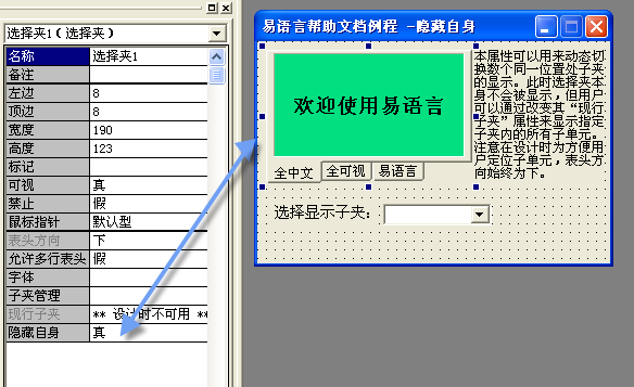 本属性可以用来动态切换数个同一位置处子夹的显示。此时选择夹本身不会被显示,但用户可以通过改变其“现行子夹”属性来显示指定子夹内的所有子单元。注意在设计时为方便用户定位子单元,表头方向始终为下。