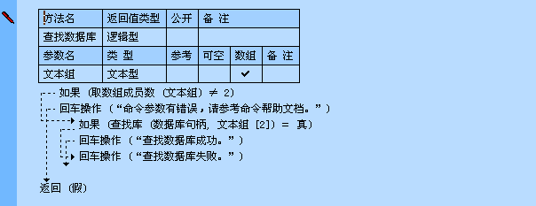 语法: 逻辑型 查找库 (MySql句柄,库名)