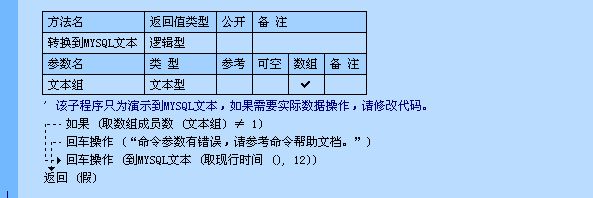 从易语言中的数据类型转换到可以被MYSQL识别的文本。可以将易语言中的时间,逻辑型到MYSQL中相应数据类型,转换成功返回MYSQL可以识别的文本,失败返回空文本。