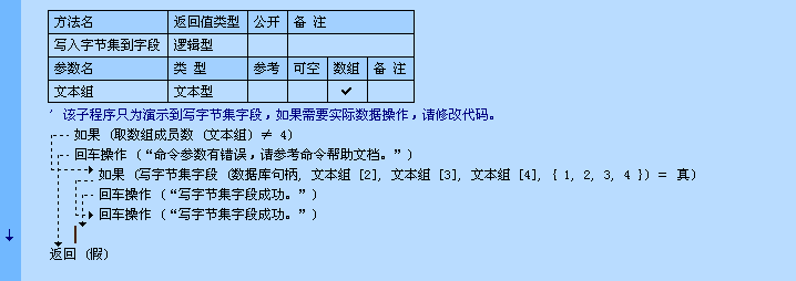写字节集字段。本命令只用于写字段类型为字节集的字段,注意:一次写入数据的大小MYSQL做了限制,如果需要改动请参考相应MYSQL手册,对MYSQL服务器进行调整。