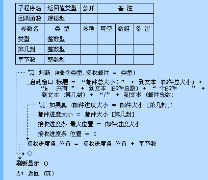 必需的;子程序指针。本参数表示函数的地址,是易语言定义的子程序的地址。为0表示取消注册的回调函数。子程序的参数第一个为“整数型”表示接收邮件命令类型值,是“命令类型”数据类型中的常量值;参数第二个为“整数型”表示接收第几封邮件;参数第三个为“整数型”表示本次接收到的数据量单位为字节。子程序返回值为逻辑型。返回真表示继续接收此邮件,返回假表示不接收此邮件。 |