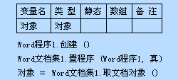 这时,我们查看word文档集的命令中有“取某某对象”的命令,这些命令的返回值就是一个对象,使用这些命令的时候必须先创建一个对象类型的变量来保存这些命令的返回值。