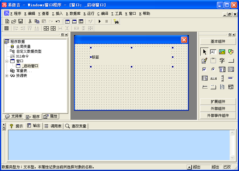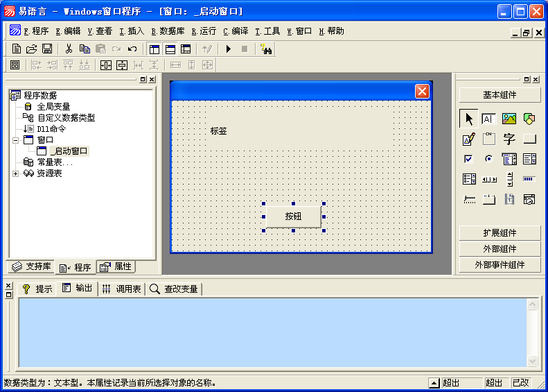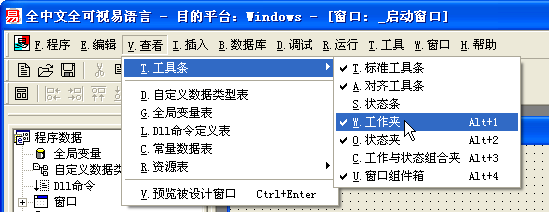 标题栏可以看到易语言的目的平台,文件名,当前窗口等信息。