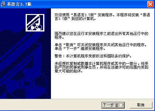 进入欢迎安装界面,点击下一步,继续安装易语言;