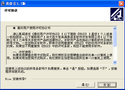 进入用户使用许可协议界面。点击“是”按钮,继续安装易语言;