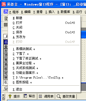 菜单中列出了易语言的功能命令,通过菜单可完成诸如打开易程序,保存易程序等功能。