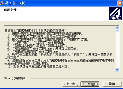 通过自述,可以了解易语言的新增功能。点击“下一步”按钮,继续安装易语言;
