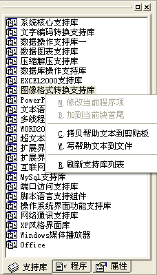 - 如果欲将这些信息提取出来打印或者以后阅读,请在相应项目上单击鼠标右键,在所弹出的菜单中选择“拷贝帮助文本到剪贴板”或者“写帮助文本到文件”功能输出与该项目及该项目所有子项目相关的帮助信息。譬如:在支持库名项目上进行此操作将输出此支持库内的所有信息。如下图,光标处;