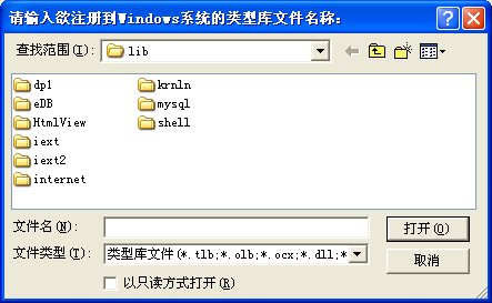 按钮选择我们自己的OCX注册到系统中,同样我们也可以通过单击“注册类型库”按钮把我们自己的类型库注册到系统中。