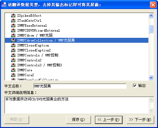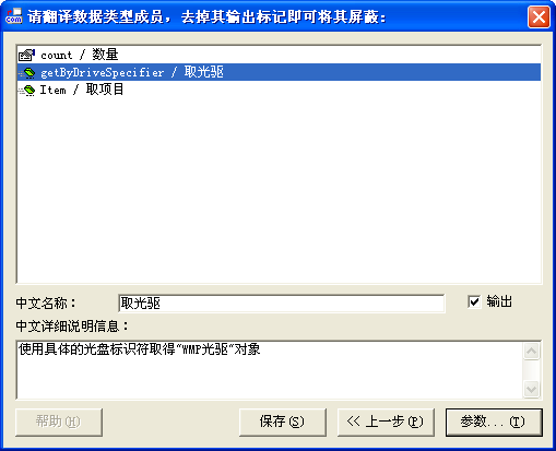我们可以看到这个OCX组件中的所有参数以及命令,我们可以对应相应的英文名称,把它们翻译成中文名称,并可以在详细说明中填入我们对这个命令的详细说明,如果输出没有选中,该条命令是无法在易语言中使用,一般默认的都是选中的,这样我们就可以制作出有我们自己个性的组件了。