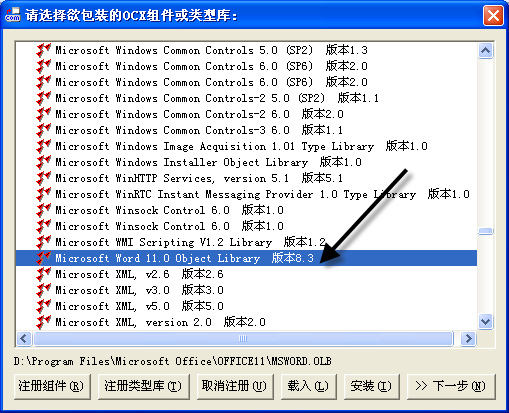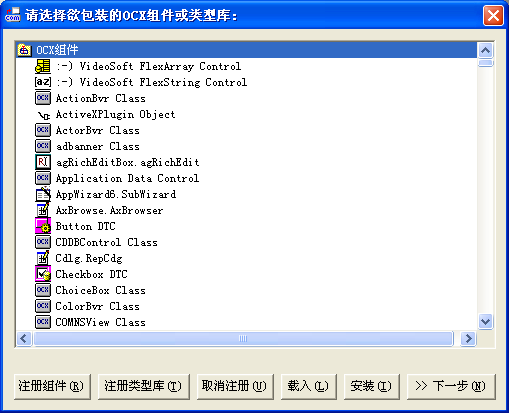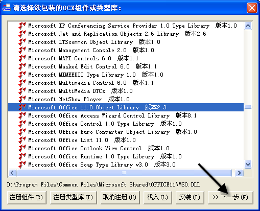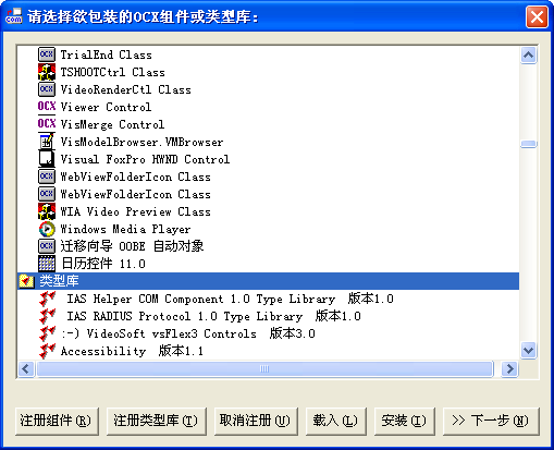 我们向下拖动滚动条,可以看到一个类型库的分类,在这个分类之前的就是我们系统中的OCX组件,这个我们已经非常熟悉了,这里就不作说明了,在类型库的分类之后,就是我们系统中有的类型库,我们可以选择我们需要使用的注册。